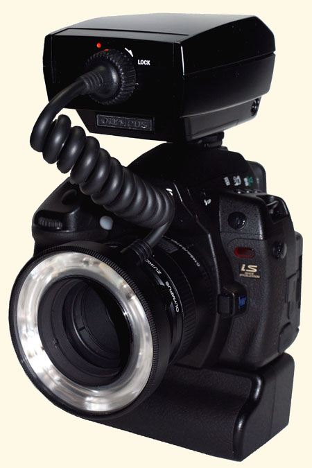 HOW TO ATTACH THE OM MACRO/RING FLASH(ES) TO E-SYSTEM: I have adapted my 'system' to use only the E-System ZD35mm and ZD50mm macro lenses, both of which have a 52mm filter ring. The only additional item required is a 52-55mm stepping ring where 52mm is the filter size and 55mm is the accessory size. These stepping rings are available at SRB-Griturn in the UK by mail order or Internet. You can go to SRB-Griturn's extensive website here. The stepping ring costs £8.00 including post in UK. Once you obtain your stepping ring all you need do is screw it into the filter ring of either the ZD35mm or 50mm lens and then mount whichever of the OM macro/ring flashes you have. Both the chosen lenses achieve their AF internally so the lens tube does not rotate when focusing. The lens tube does traverse fore and aft and in the case of the ZD35mm Macro, protrudes a good inch at 1:1, so bear in mind you are attaching a quite large 'mass' to the front of the lens so there is bound to be some additional strain put on the internal mechanisms. I do not believe the additional weight of any of the flash units pose a threat to your lens but please, do this at your own risk. It may be possible to utilise other ZD lenses, those with filter threads of 58mm by stepping down from 58mm to 55mm, but I'm sure this would bring spherical vignette so I haven't pursued it further. If you fancy trying it, let me know how you get on. In any case the two lenses I have adopted are best choice for the intended purpose. ILLUSTRATIONS: Below are a couple of photo's of my set up. Other than having to use manual they offer virtually all the functionality of the new E-system macro/ring flash units at a fraction of the cost.