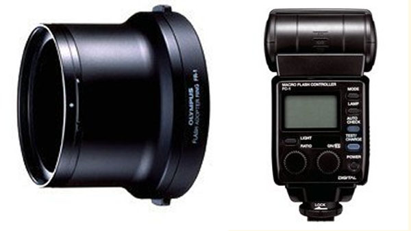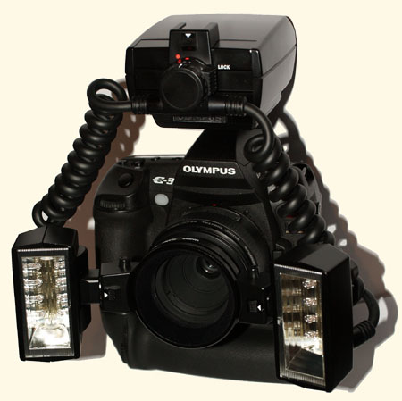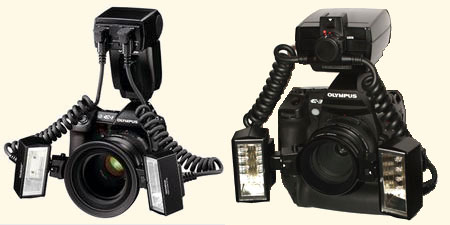 INTRODUCTION: One of the commonest subjects raised with me by emigres from OM to the Olympus E-system is whether it is safe and practical to use OM system flashes on their new cameras. USE OF STANDARD T20, T32, F280 on the E-System: This question has been asked almost from day one of the E-1 for good reason; the cost of E-system flashes is exorbitant. Quite simply all OM flashes are safe except the 310 series which have a high trigger voltage and must be avoided. I have used the T20, T32 and F280 on the E-1 without issue; I have not tried the T18. Each of the flashes can be used in manual mode and full auto mode but NOT in TTL or FP mode (where available). This is because the circuitry within the E-system cameras is designed to co-exist and communicate with the E-system flashes giving a high degree of compatibility especially with the zooming heads. OM flashes on the other hand were designed to communicate with OM2 onwards to provide full control of the flash duration/intensity as metered Through The Lens (TTL). While these flashes can be used successfully, they do require some level of understanding in manual mode and practice in full auto mode, to get the best out of them. Because the results can occasionally be a little flaky I don't particularly recommend any of them due to the loss of functionality. But with a slave trigger or studio light extension they are useful for secondary lighting or hair lights. The E-system all-purpose flashes, FL20 priced at £90, FL36 priced at £179 and the FL50 priced at £350 simply offer so much integration that trying an OM workaround is not worth the effort. But when it comes to the specialised flash systems offered for E-cameras for use in macro and super macro arenas the prices do make you swallow hard. E-SYSTEM MACRO FLASH: Macro and ring flashes are used to improve the harsh highlights and shadows cast by direct flash units; ring flashes produce pleasant diffused 'all round' lighting that is virtually shadowless whereas twin macro flashes can be angled and positioned to illuminate the subject exactly as the photographer wishes with highlights and shadow areas directly under his control. These come as two distinct units: 1. The simpler ring flash, FS-SRF11 that sells at £500 and fits the 50mm Macro lens and lenses with a hood/filter ring of 67mm (14-54 & 50-200) with the use of the adapter FS-FR1. 2. The more complex FS-STF22 Twin Flash that sells for £600 and fits the 50mm & 35mm Macro, 11-22, 14-54, 12-60, 50-200, 14-45 & 40-150, with the adapter FS-FR1 (£100) and a further adapter ring (included). The controller unit that is included with either flash choice is separately priced at £320. Whichever way you choose to go this is an expensive system that only works with certain lenses, though full compatability and seamless TTL integration with any E-system body is delivered.