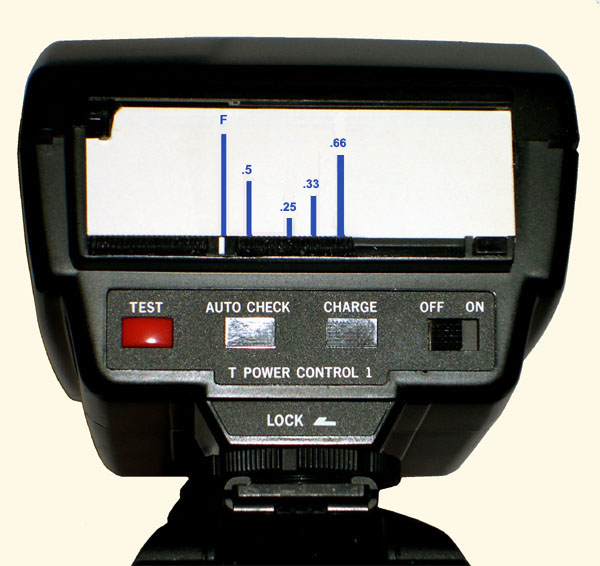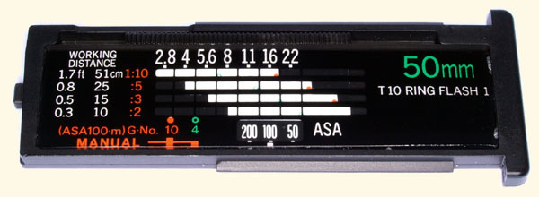 HOW THE OM2 CONTROLLED THE EXPOSURE IN TTL MODE: In 'automatic' flash exposures using T series flashes, the light falling on the film is metered during the time the first shutter curtain is fully open and when the pre-determined level of light has been received for correct exposure the flash source is turned off and the second shutter curtain is closed. This system is known as Through the Lens Off the Film metering; TTL OTF. This is 'relatively' straight forward as the maximum synchronisation speed is set to 1/60th, the film speed setting is accounted for in the overall metering and both ambient and flash generated light is measured by the chip as it comes through the lens on to the film. This is achieved with the T series flash panel inserted to show 'Full automatic control by OM2'. With the panel flipped the 'manual' control side shows so you can set the flash intensity (G No) against the lens aperture (and vice versa) to suit conditions. Remember the OM system used 1/60th flash synchronisation and of course the ISO(ASA) was determined by film choice and therefore fixed unless you push/pulled the exposure mid-roll and developed accordingly. In manual mode there are two flash output settings, full and half (on the illustrated T10 panel below, G No 10 or 4), with the exposure calculated by a mix of film speed (ISO/ASA), distance and aperture, judged and set by the user. Thus if you were using ASA100 film and the working distance is 1.7feet, the aperture would be between f=5.6 & 8.0 at GN 4 or f=16 at GN 10 (please see photo of panel below).