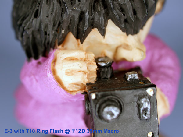 As said earlier the whole process sounds far more complex than it is; once you have experimented you will soon have a 'feel' for the job in hand and be altering the variables to give you maximum depth of field available, or the fastest shutter speed you can get away with by halving/doubling the other variables. On the subject of shutter speed 1/400th on the E-3 is very usable as the shutter vignette is only the slightest darkening along the bottom edge of the frame (maybe 5 pixels in height) and can be easily cropped out. The shutter on other E-system cameras is not quite as generous but does give a clean image at 1/320th. A high shutter speed is imperative if you are photographing live insects for example. Of course the precise correct exposure depends on the subject material, colour and the ambient light so further opening and closing of the aperture around the suggested guide is ultimately up to you. We have all the necessary feedback on the camera via the screen and histogram. Don't forget to leave your INFO button set to show either shadow, highlight or histogram so you can check the results immediately. I've found that different E-Cameras give very slightly different results so it is not really possible to provide guidelines for each model. The chart above will get you within 1 stop of the correct exposure with any E-Camera. On a final note the T Controller has the usual 'CHECK' lamp on the back panel that glows if the unit 'thinks' the exposure is accurate. Ignore this lamp, it tells you the exposure was correct in virtually all circumstances. There follows three quick and dirty examples using the above chart I undertook with a favourite macro subject of mine, 'Stinker' who stands 2" high. Distance setting noted on images, all else as per above chart for that distance. JPG's straight from the E-3, not processed only resized for web viewing.