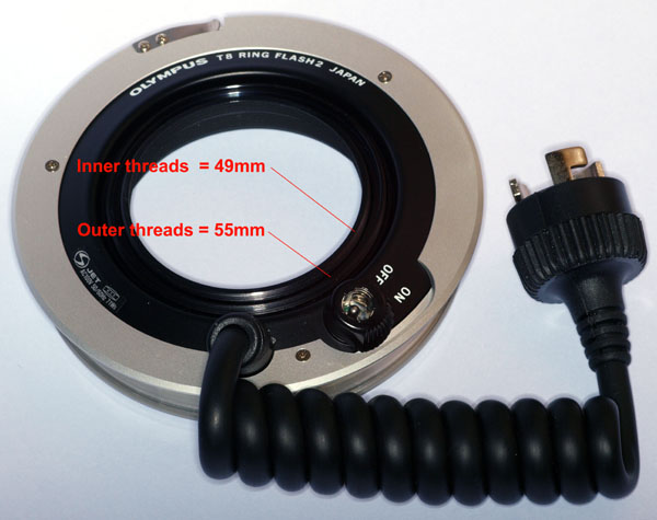 USING OM MACRO/RING FLASH(ES) ON E-SYSTEM: Those of you with OM macro/ring flash units already languishing in your cupboards or those who might be tempted to buy an OM set secondhand hoping to use it occasionally on your E-System, will be pleased to read I use mine on all my E-bodies. One of the advantages of using the OM system macro/ring flashes with the E-3 is that the flash duration allows the use of shutter speeds up to 1/400th of a second with only the slightest hint of shutter vignette and totally free of vignette at 1/320th with all E-system cameras. This is a third of a stop higher than the E-specifications indicate and much higher than OM. This is quite significant, especially as you are sacrificing any TTL control. Remember, the ring flashes T8 and T10 and the twin-head unit flash the T28 originally designed exclusively for the OM 2 onwards, lose any integrated compatibility and must operate manually. But, if you are prepared to spend a few minutes understanding how to operate these units in full manual mode they do offer an affordable and capable alternative to the very expensive E-system options. Obviously, the first way to use these units is to restrict their use to OM Zuiko lenses on your E-camera with 4/3rds to OM adapter. In this case you might choose either those OM's with good close focus abilities or the dedicated OM macro lenses. In some ways this is is a good option as you will be in total control of focus, aperture, exposure and flash; but it is not the most convenient. If you fancy operating a hybrid system by integrating the older OM macro/ring flashes with your E-body and one or two dedicated ZD auto focus lenses then you need to understand how the old units attached to the OM system. Firstly, the OM units were usable with either 49mm or 55mm filter ring lenses (this covers 95% of OM lenses) by having twin mounting rings built into the either of the two ring flash units or in the case of the T28 the flash shoe ring. These rings screwed into the filter ring of any 49 or 55mm lens. This facilitated use of these flash units across the range of OM Macro (and other) lenses as well as working in conjunction with the unique 65-116 macro tube and macro bellows. Below is a photo of the underside of the T8 unit showing the twin mounting rings; 49mm & 55mm.