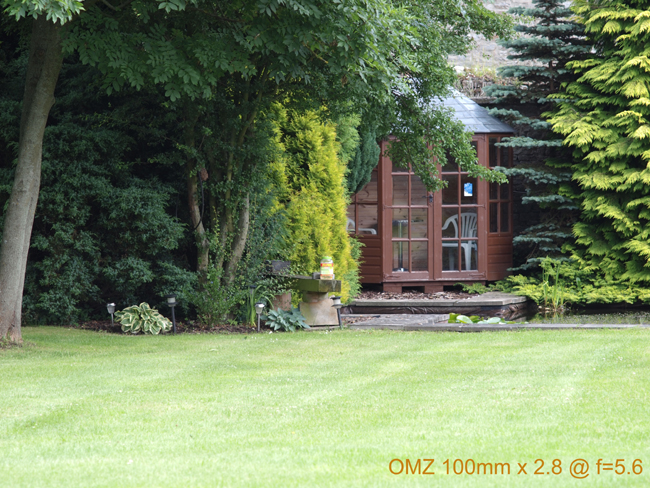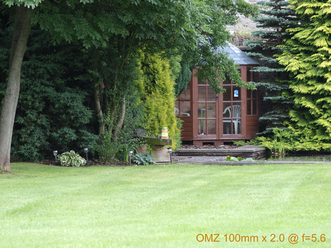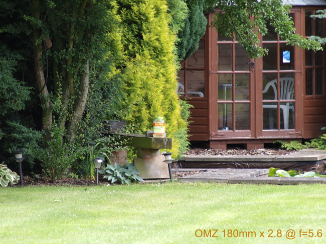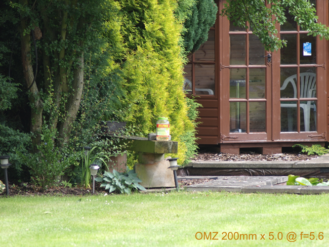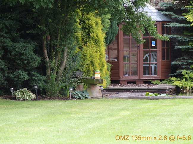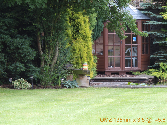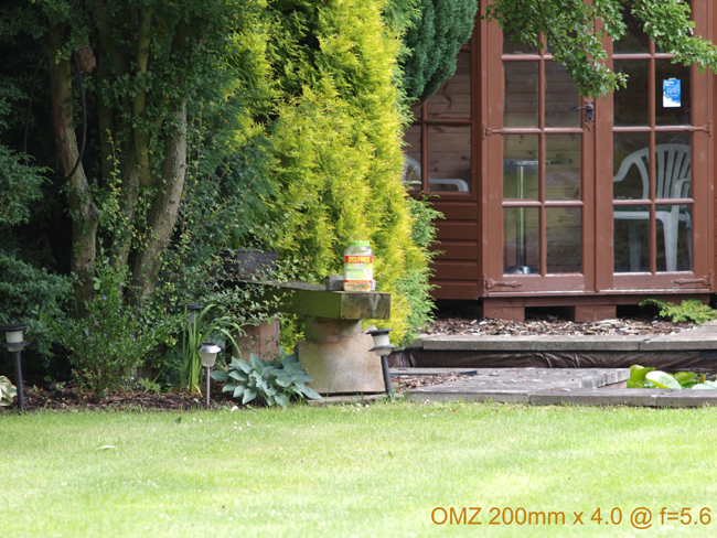 600mm x 6.5: Easy focus with MF assist 10X. This lens is rack and pinion focus. The 600mm is a huge lens and must be tripod mounted. The tiny E-P1 looks slightly ridiculous on the back of this lens! I shot 3 images at wide open, F8 and f11. There is no purple fringing that I can see. In the f8 test the target area sharpness is excellent; the result at f=6.5 is identical except for bokeh; the result at f=11 is also identical. The EFL is 1200mm making this lens a very powerful albeit huge super-telephoto. It is usable wide open and there's no appreciable difference as the aperture is stopped down; sharp to f=16~22. Ideally requires a gimbal tripod to enable swift movement. (This lens was several thousand pounds when new and can be bought for £6-800 today.)