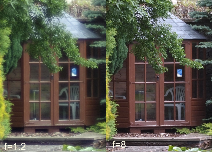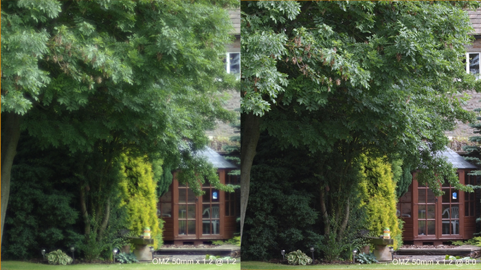 You will come across the word 'ghosting' in the following article many times. This phenomena is caused by light bouncing around the exposure box creating a peculiar softness in the image almost akin to a double image. It is more prevalent when the light source is strong. This occurs with all E-System cameras I've used when using most fast OM Zuiko lenses wide open and is to do with light being reflected back and forth between the camera sensor and the rear element of the lens. The larger the rear element, its curvature and distance from the sensor, the greater can be the problem. Here is an example taken with the OMZ 50mm x 1.2 (rear element 38mm diam) fast standard lens wide open next to the same scene in the same conditions taken within seconds at f=8, on the E-P1.