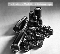 One of the central advantages the M1 displayed was that of vastly reduced noise and vibration from mirror and shutter mechanisms, a major criticism of all contemporary 35mm cameras. Anyone who has used an early to mid seventies non-Olympus SLR will know the problem, a resounding ‘kerrplunkkk’ and the disconcerting feeling that the shot you’ve just taken is spoiled by camera shake. Mr Maitani addressed this problem by designing the M1 from the ground up rather than taking existing mechanical solutions and modifying them. He looked at the whole concept of the 35mm SLR and tried many solutions to problems before being satisfied. He first turned his mind to his ambition of a full-frame 35mm SLR in 1966 and 6 years in development underlines just how enormous the task. A brand new shutter and oversize mirror box was conceived with air damping, new curtain drums, mirror lock and a new standard in field of view of 97% that almost reaches today’s WYSIWYG boasts.The E1 has a different set of problems to overcome though addressing the same basic issue – more accurate image capture. A major concern with all SLR’s is that of dust entering the body cavity when lenses are changed. The conventional SLR relies on the user to keep screen and mirror clean with soft brushes and blowers. Because the digital SLR uses a highly sensitive CCD to capture the image the pixels are open to contamination causing image deterioration or pixel failure. Previous cleaning methods are too crude. So Olympus has developed a membrane (Anti-Dust Function) that is self-cleaning (Supersonic Wave Filter - SSWF) to protect the CCD. Basically the membrane collects the dust and the SSWF twangs the membrane and the dust falls away. It is obviously far more complex than this and relies on hermetic seals and ultrasonic waves, but that’s the general principle. In addition the bright, easy-to-see viewfinder satisfies the demands of the professional photographer with a field of view that is 100% of the imaging area. Both M1 and E1 refer to their inherent ruggedness and the 1972 literature tells us ‘reliability is provided by the rigorous 100,000-time testing of the cameras vital shutter, winding and mirror mechanisms’. The E1 boasts ‘a durable shutter that can stand up to 150,000 snaps’ [snaps being the activation of shutter in anti-dust mode]. On the face of it, as system cameras, the M1 and E1 seem miles apart, though this deserves further consideration. The single page from E1 brochure shows the system, comprehensive yes but nowhere near the 280+ M1 system. In fact my scanner bed is not large enough to reproduce the M system diagram in full. | |