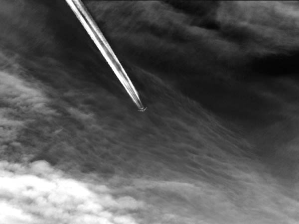 I include the photo below for no other reason than this plane flew over (30,000ft) just as I was finishing the Maneki Neko shots. It is with the ZD 50-200 at 200mm wide open and handheld. Post processing in PSCS was restricted to auto balance, slight brightness and contrast enhancement and conversion to mono. (No cropping or enlargement).