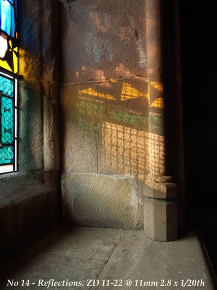 I take this from about 5" at FL of 22mm. With an image size of around 4" I struggled to work out the ratio and thank Jens Birch for putting my first attempt right. It is (I'm assured) the equivalent of around 0.13:1 in macro terms. Detail is adequately sharp though I admit I could have perhaps found a better target to show close-up capability. Oh well. On the way home I call at Gilling West, a long straggling village reknowned for its larger, more ornate church. I have a look in. I'm no lover of church interior shots but wanted to see how the lens performs in low light. Well it's certainly low light in here! I realise I've left my tripod in the car but being an idle so and so I make do and handhold. This reflection catches my eye: