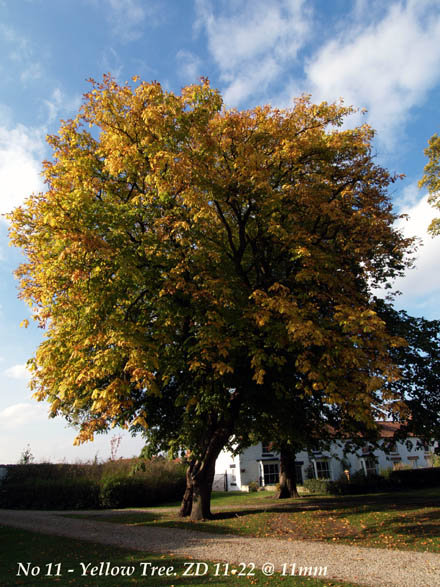 This image is deceptive. It appears quite a small tree. It's spread was surprising broad. I wanted to see how the ZD 11-22 would deal with the repeating verticals of the metal paling fence and cottage verticals behind. You can see I didn't need the lens' maximum and this is captured at 16mm (about 35mm in film camera terms); this result is very easy on the eye. Just around the corner is the pleasant village of Pirecebridge with a lovely tree clad green. This mature specimen is just starting its autumnal change: