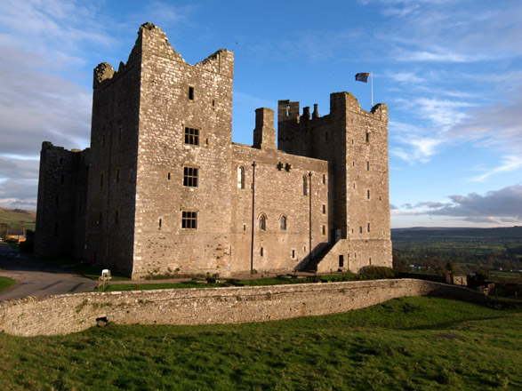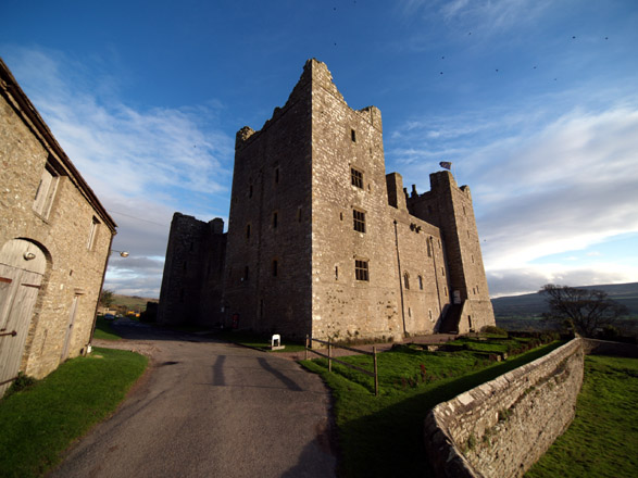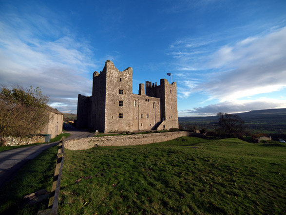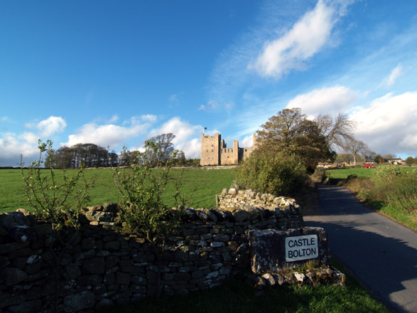 OUT ON TEST Today I look for a subject that will firstly show its Ultra wide-Angle capabilities and later its low-light capabilities. It is early November, bright but showery, clouded to the West with associated haze, very cold and windy. As the afternoon draws out the light, already contrast laden, gets almost over-saturated. The E-1's basic settings for this session are ISO = 100; WB = AUTO; FILE = SHQ; LENS FILTER = NONE - PETAL HOOD INBUILT. Castle Bolton lies about one third up the Ure valley - Wensleydale; one dale further West than my native Swaledale. The tiny village that sits high on the Eastern escarpment of the valley is in turn dominated by an imposing castle, famous for imprisoning Mary Queen of Scots before she 'lost her head'. Unusually the castle is still partially inhabited with the North wing or Tower (with the flag), being permanently occupied. The castle is open to the public though it has been many years since I 'did the tour'. The castle enjoys a magnificent stand with commanding views over the broad sweep of Wesleydale. To set the scene my first shot of the castle is from the village boundary and taken with the ZD 11-22mm which I tend to use now as my 'standard' zoom in place of my previously troublesome ZD14-54mm. The long shadows tell you it's late in the year, though early in the afternoon: