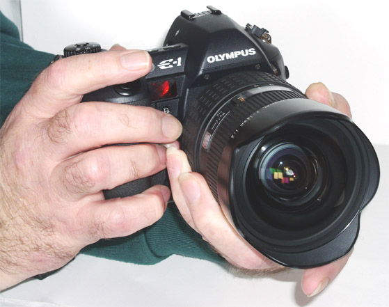 Above: my E-1's resting position between shots - Hmmm. ___________________________________________________________________ If I remove the HLD2 grip from the E-1 body the combination takes on a more balanced but squat look. Now it sits comfortably on any surface as the camera base and the lens bottom are in the same plane. Problem solved? Unfortunately not. Apart from losing the benefit of the HLD2 grip another more serious ergonomic issue surfaces. One might think a larger lens barrel might lead to better handling - as with the ZD 11-22mm - well, only partially with the ZD 7-14mm. When fitted to an E-1 without the grip the ZD 7-14's huge barrel ensures the left hand has a better grip and indeed the camera and lens can be easily balanced in the left hand only. That's good isn't it? Not quite.