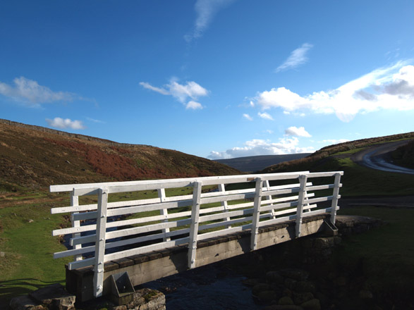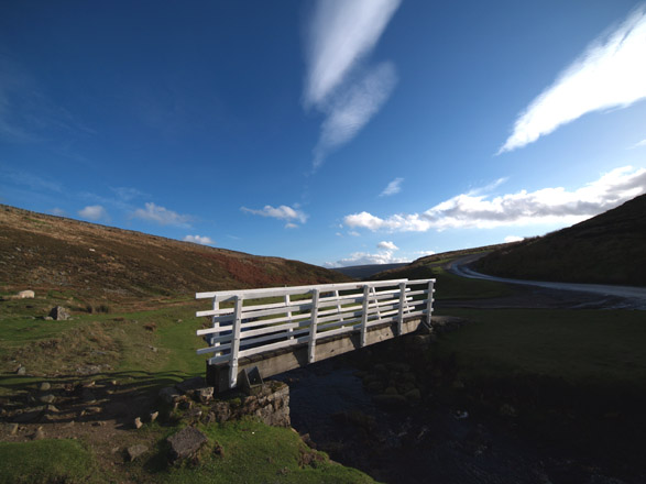 Exif: ZD 7-14mm, FL=7mm, f=4.0, 1/1600th, Mode = A, compensation nil ___________________________________________________________________ Here are two shots of the footbridge adjacent to the watersplash made famous in the film 'All creatures Great and Small' based on a James Herriott novel. (Alf White actually). Sporting a fresh coat of brilliant white paint it was difficult to achieve the correct metering in brilliant afternoon sunshine casting long shadows. First image is at 14mm.