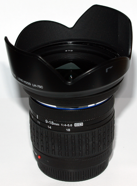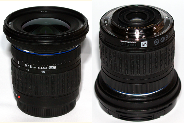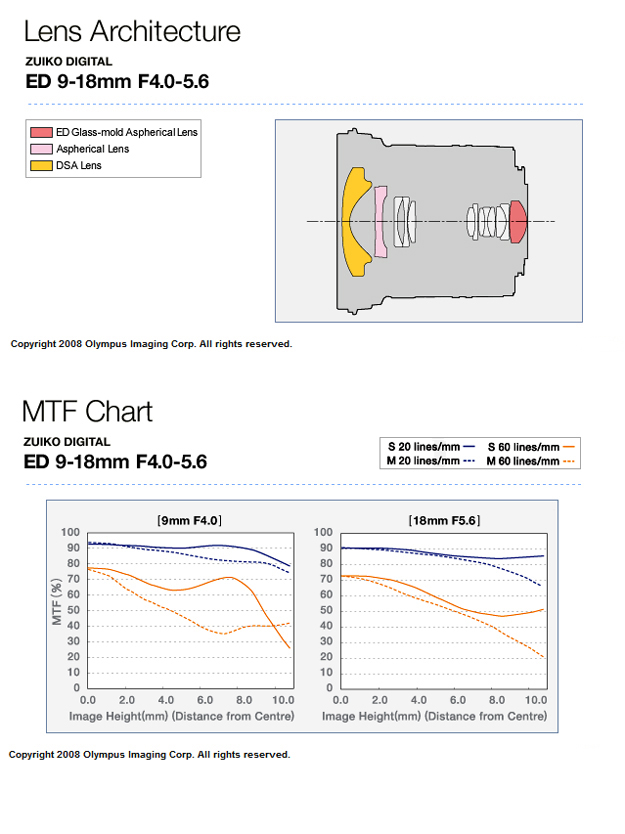 MANUFACTURERS DESCRIPTION: * Ultra-wide-angle performance 9-18mm (18-36mm) 1:4.0-5.6 * Super compact (76mm) & light weight (280g) * Extreme wide angle lens with 2x zoom The ZUIKO DIGITAL ED 9-18mm (35mm equivalent focal length: 18-36mm) is an ultra-wide-angle lens offering a 100° - 62° angle of view. With its lightweight (280g), compact design (just 73mm long) it is outstandingly portable and makes super-wide-angle photography friendlier and more affordable. (Errors amended by me.) TECHNICAL SPECIFICATIONS: Focal length 09 mm - 18 mm: Focal length (equiv. 35mm) 18 mm - 36 mm Lens configuration 13 lenses 9 groups Aspherical glass elements 2: ED lens 1 Lens mechanism; floating focus mechanism Angle of View 100 - 62° Closest focusing distance: 0.25 m Maximum image magnification 0.12 x 0.24 x Number of aperture blades = 7 Maximum aperture 1:4.0 (wide) / 1:5.6 (tele) Minimum aperture; 1:22 Filter diamater = 72 mm Dimensions; 79.5 mm Ø, 73 mm length Weight = 280g Compatible to Tele converter EC-20 - Yes Compatible to Tele converter EC-14 - Yes Compatible to Extension tube EX-25 - No CHARTS: