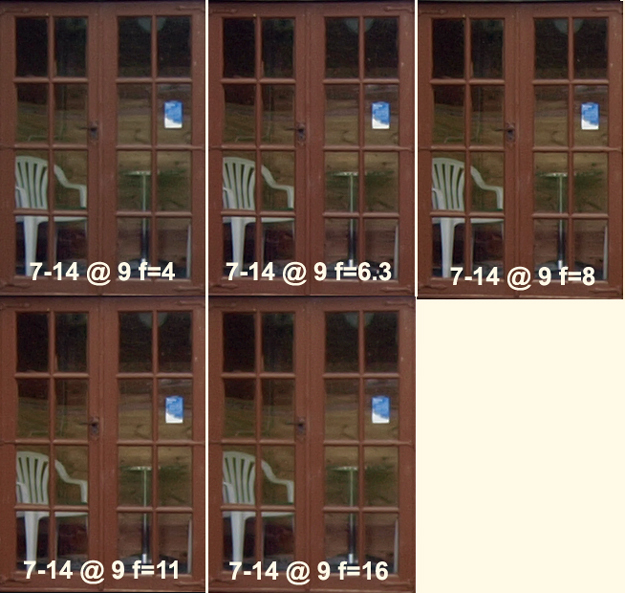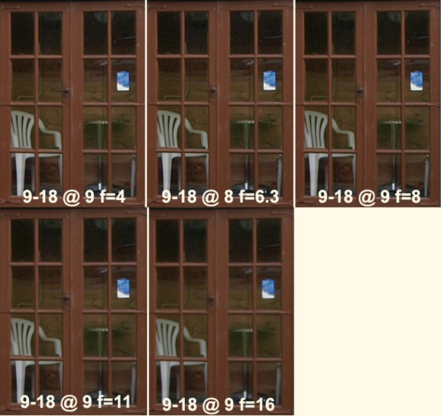 The following two sets of crops are taken from a series of images shot at 9mm and then zoomed into 18mm and taken at an aperture progression of F=4, 6.3, 8, 11, 16: