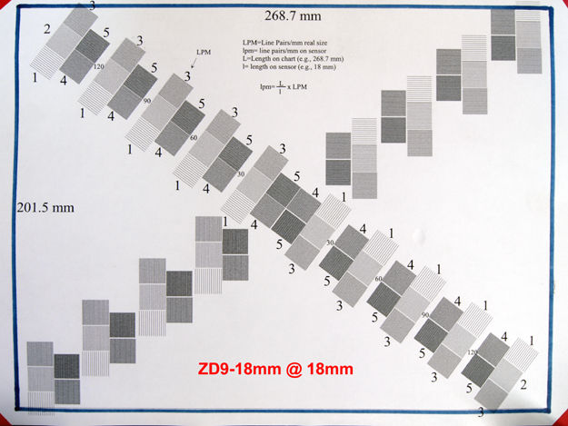 COMMENTS ON STANDARD TEST: These results are generally in line with most other 'budget' lens offerings from Olympus and follow the accepted norm of being a tad soft to soft wide open, sharpening up rapidly and in sequence as the aperture is closed up to around f=11 when softening sets in again as diffraction affects performance. During my time with the ZD9-18mm I found f=6.3 delivered the most consistent results. At 9mm your aperture choice is limited if you are strictly concerned about 'critical' sharpness. However, the results do sharpen up in post processing with some sensitive application of unsharp mask. However, at the 18mm end, sharpness performance improves significantly and good results can be had from apertures between f=5.6 and F=11. We simply cannot expect to have sharp images wide open from these 'budget' offerings compared to the 'top pro grade' series which also benefit from faster glass and weatherpfroofing. I'm pretty impressed with what I've seen so far. Of course the ZD9-18mm is not perfect; it has a bit of complex distortion and is a bit soft wide open - but generally it is a good performer. Please remember it is not that long ago that an OM Zuiko prime 18mm lenses would set you back £950 and the widest Olympus zoom you could buy was the OMZ28-48mm f=4 (equivalent to a ZD14-24). All lens design is a compromise but it's obvious to me this generation of lenses is far more sophisticated than the previous prime generation and the designers are really working those computer models hard to find the ultimate compromises. Things have surely moved on a pace.