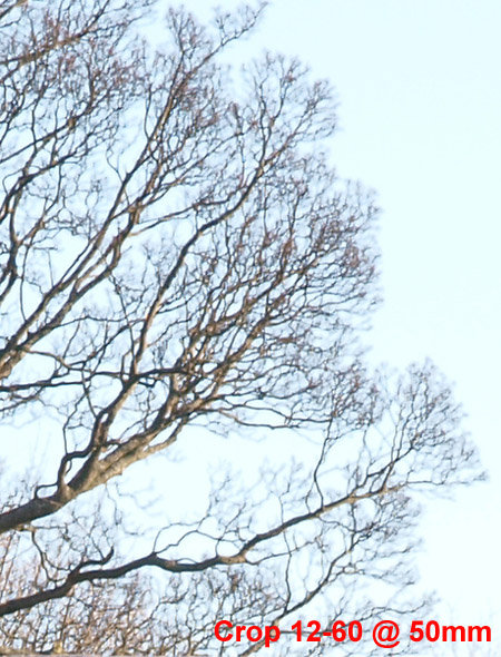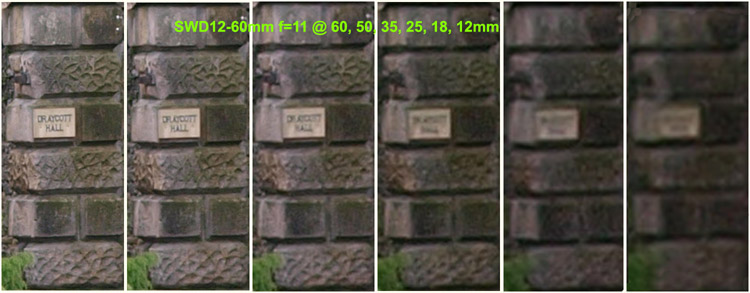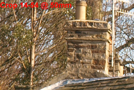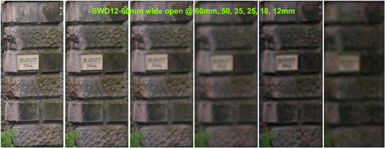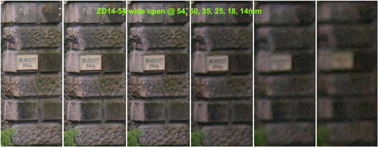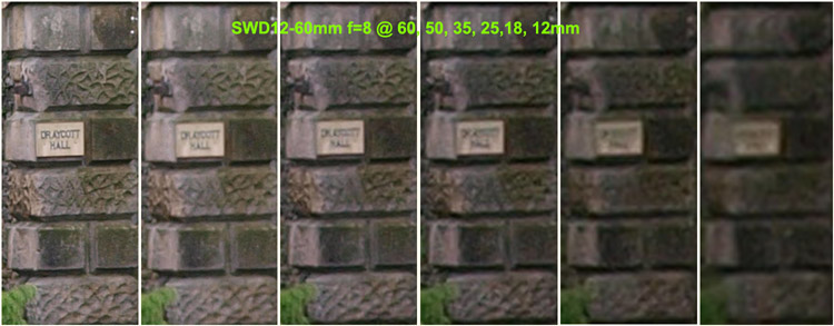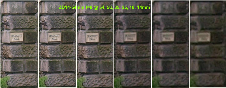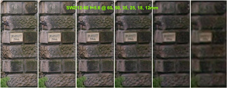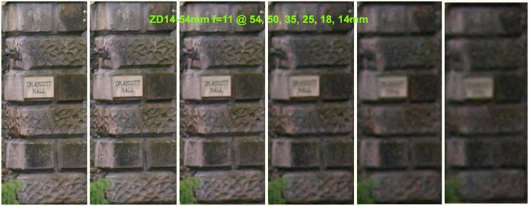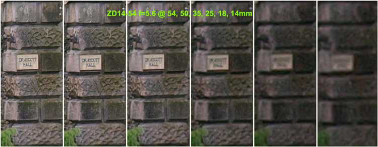 Observations on SET 2: Looking across the crops from the SWD12-60mm set to f=5.6 there's a consistent loss of detail between each crop as the focal length diminishes. The consistency is better than the crops of the lens wide open with no one crop appearing out of place. At f=5.6 the SWD12-60 lens can resolve the house sign at 60, 50, & 35mm with the crop at 25mm almost resolving the sign. Wider than this the sign is just a blur. Comparing the lens set at f-5.6 and wide open there is a definite improvement. Looking across the crops from the ZD14-54mm set to f=5.6 there's a consistent loss of detail between each crop as the focal length diminishes. Again, the consistent loss of detail diminishes equally as the lens is zoomed out with no particular focal length suffering. At f=5.6 the ZD14-54mm lens will easily resolve the sign at 54, 50 & 35mm with the crop at 25mm almost resolving the sign. At wider lengths than 35mm the sign is a blur. Comparing the F=5.6 result against the lens wide open there's a definite improvement. The best result must go to the ZD14-54mm lens as it seems a tad sharper (consistently) across the crops than the SWD12-60mm at f=5.6. Now that surprises me. SET 3: