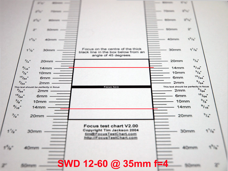 SWD12-60mm & FOCUS: I've seen some debate on the forums about focus issues with the new lens. I also noted earlier that I must sharpen up my own act when using the new focus system as, frankly, it seems easier to make fundamental errors with this sophisticated focus regime. It's been my experience that many of the issues I've come across when reviewing lenses and bodies have been down to me, either not appreciating the best setup or method or failing to do the test properly. This is particularly relevant with the E-3 as it offers new technologies far different from any previous E-Camera. It is too easy to blame the machine. All that said it seemed fitting before I start my humble testing to make sure that the new lens does not suffer from some basic flaw, such as front or back focus. Therefore, I repeat the tests I did when I (wrongly) suspected the Sigma 30mm x 1.4 might have a back focus issue here. To be honest I had no suspicions about the SWD12-60mm during my period of familiarisation (OK messing about), but for the sake of a further quarter of an hour I would undertake Tim Jackson's test detailed at this site www.focustestchart.com, aimed at Nikon but can be used to test any lens/camera. It's not complex by any means and only takes a little time and thought to get it right. Here is the result following the downloaded PDF instructions as accurately as possible.