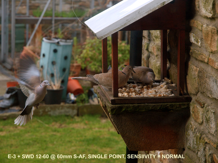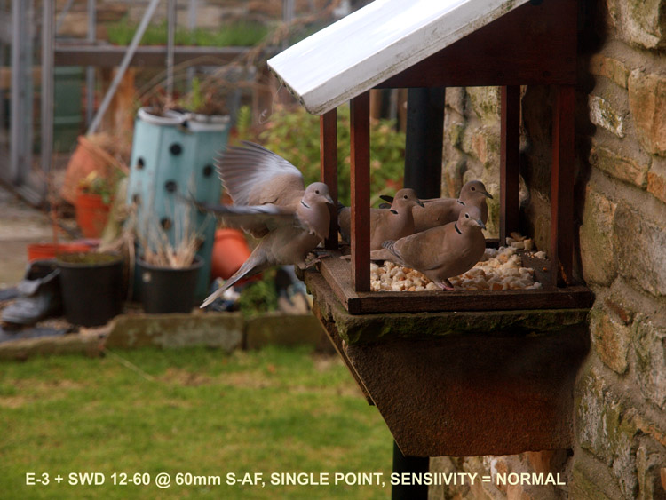OBSERVATIONS DURING TEST: I set the camera to S-AF, AF point to centre, normal sensitivity and placed the centre point on the box in a vertical line shown by the right hand line and tried several AF's vertically. I recieved focus beep and green lamp on every occasion. Next I placed the centre point on the edge of the box in the middle of the two vertical red lines. I got the same result. Next I placed the centre point on the wall chart in a vertical line shown by the left hand red line. I received focus beep and green lamp BUT the box was in focus, not the wall. When I moved the placement of the centre AF point to the left of the vertical red line I got an AF fail (hunted in and out) because the area focused on has no contrast - just like my cupboard doors. Providing I kept the placement of the centre point any where along the centre of the two horizontal red lines running left of the vertical box I got no AF lock. I repeated the test running the opposite way with the same results. I changed only the AF point to 11, rest as was. I then repeated the placements of the centre point exactly as above. This time I received the focus beep and green lamp as long as one of the 11 points remained to the right of the vertical red line on the left of the box (even though the extreme right hand focus point was beyond the edge of the box). But as soon as the far right focus point was to the left of the left hand vertical red line I received focus beep and green lamp from one of the other 11 points that was now positioned over the edge of the deep grey line (or near to it), thus confirming positive and accurate AF. I repeated the test running the opposite way with the same results. Next I tried small sensitivity with centre and 11 points and saw no discernable difference. Next I tried the dynamic pattern and again found little difference to the result but do not understand why the focus point giving the confirmation does not light, only the centre point - this aspect of the mode is most confusing and could lead the user to 'believe' there is a AF fault. (I stopped using this pattern for this reason and not only for simple testing). I also have the Fn button set for AF home; this cycles between 11 point and whatever you set as your preferred AF point mode. I find this very useful especially as I no longer use the dynamic pattern. In dynamic pattern it was very easy to assume I had found an issue with AF, but on more repeat tests I am confident in saying it is the refusal to light the 'in-focus' point that leads to confusion and not a discrepancy of this mode, hence my refusal to use it. This arises from the fact that only the centre point lights leading you to think you are in single point mode; thinking this and then obtaining an AF lock well outside the centre point immediately, but wrongly, raises doubts as to AF efficacy as the dynamic mode is producing the AF pattern it should. CONCLUSIONS: To be honest, this is what I expected; the AF has behaved as it should. There is a ring running round each AF point larger than the point itself that is sensitive to the AF feedback (the area of this ring can be varied, hence sensitivity setting choice of small or normal) which means that your selected AF point can be slightly 'off target' but still find a lock and indicate that lock on the AF point nearest to it by lighting it up. The red vertical oblong represents this area covered by AF even though the points are just outside the marked area. In addition the refusal of AF to lock in test one (single point) was immediately corrected by test two that employs all 11 points. This confirms it was the nature of the target, not the AF mechanism, that caused the AF to fail. Is this not the way it is supposed to work? If single point fails to lock due to low contrast/low detail then switch to 11 points to give the sysytem better chance of obtaining a lock. If both fail then use the manual ring. My general advice is to avoid dynamic mode and set the Fn button preference to AF HOME which gives instant access to switch between single point and 11 point AF in one press. Leave it like this until you are happy that you fully understand how the AF system works in difficult situations before re-deploying dynamic mode just to avoid confusion while you get used to the system. AF IN REAL LIFE: On a not too bright Monday afternoon I watched some collared doves visiting the bird table outside my kitchen window and decided to try some test shots. It struck me that the birds plumage was not far away from the colour and texture of my study doors and with single point AF this may prove challenging for the camera. Now while these birds seem to flutter and fly slowly I found it impossible to follow them in flight to and from the table, so had to use a different method. When three birds were feeding I focused on the nearest and with both eyes open waited to see the fourth arrive. As soon as it entered my field of view I squeezed the shutter for a burst of 4 or five shots. I didn't use 11 points as I wanted the main focus to be the birds on the table; had they been out of focus as well as the incoming bird the shot would have been binned. These moments pass so quickly it was impossible to track the bird on the table as it was moving about as well, so once I had framed it was a matter of squeezing the shutter and letting the AF do its work whatever wandered in front of it. Hand-held, IS on, ISO 400, F4 at 1/380th. Here's the results: