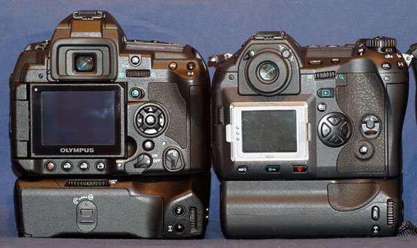 IN MORE DETAIL: Rear of camera: The back of the camera is dominated by the large articulated screen housing (2&5/8ths x 2&1/16th) and hinge arrangement with OLYMPUS impressed into its protective 'shell' side. The actual viewing area of the screen is quite modest at 2" x 1.5" giving 2.5" across the diagonal. Screen pixel count is 230,000 and there is no mention of hyper Crystal LCD, only OLYMPUS on the viewing side. Its double articulation allows use in many positions and easily facilitates overhead and ground level shots as well as being fully useable when pointing forwards for self-portraits or just getting in the frame! I found the default setting a touch low for my use and increased it by +1 in the menu. That said the screen is exceptionally clear, displaying good contrast. As with other Olympus DSLR's I note on-screen magnification of images seems not to access any more data at above 10X zoom. Unlike the E-1 there is no clip-on screen protector on the E-3 so one of the first things I did was to install a screen protector which are readily available and inexpensive. There's no doubt, digital camera screens are subject to greasy smears from the nose and fingers; it's a good idea to always have a dedicated screen cloth in your bag. I notice the 4-way controller is slanted towards the users right thumb which is a nice ergonomic touch. Some of the exposure control buttons originally shown on earlier prototypes were fitted with tactile identifier 'nipples'; these are now just plain round flat or round domed. That's a pity, such 'nipples' would have provided feedback. At the bottom left are the main ON/OFF and CARD door mechanical switches. I can't seem to get used to these, to me they are counter-intuitive; I want to operate them the wrong way. Front of camera: The front of the camera houses the selectable WB sensor, the external synch plug and the DofF preview button with the wired remote control socket to the users left. Below and near the LCD panel hinge are placed the USB and video sockets and with mains power-in below; both have thick moulded rubber doors. Above the Image Stabilization badge is the IR remote control receiver. I'm not sure about the IS badge. Personally, I think Olympus might have been better advised to leave it off or make it less conspicuous. Bottom of camera: On the bottom plate of the camera is the metal tripod bush in line with the lens centre line, the battery compartment hinged door release and the ID plate. I note the body is 'Made in China'. Button placement and function are dealt with in section II. HLD4 BATTERY GRIP: If this section seems out of sequence bear in mind I received the grip some time after starting this review! In line with most other DSLR's Olympus offer a battery grip for use with their 'Pro-level' cameras and the E-300. The E-1 had its SHLD2 and the E-300 its HLD3 grip. For those with the E-330 modifications can be made to the HLD3 that allow fitting to the E-330, or there's a non-OEM model available. For those with the E-500 it's an after market model only. E-400/410 have no such choice available as yet, and I assume the E-510 will be provided with a non-OEM grip choice soon as it is so similar to the older E-500. The E-3 has its own dedicated grip, the HLD4. Many commentators, including me, get a little rattled that Olympus describe the E-series machines as 'system' cameras when they are clearly not. The grip is just one example. In OM days the 'equivalent' to the power grip, the winder, attached to all OM models and the more powerfull Motor Drive attached to all single digit OM models. None of the E-system grips is interchangeable. I do not know if this applies to other manufacturers systems. In addition Olympus have abandoned the large BLL1 power source of the E-1's power grip which could run (seemingly) forever on a single charge and now use twin BLM1's in the E-3 grip. In some ways I can see the logic but for those upgrading from E-1 this makes their 'system' even more redundant. I for one am sorry to see the demise of the BLL1 power supply and am sure Olympus would have been better advised to use the same set-up on the E-3. Surely it is not beyond design capabilities to offer one power grip for each of the E-series; one for top grade; E-1 & E-3 and one for mid grade; E-510, E-500 etc. Perhaps this is just me. Perhaps modern cameras are just consumer electronics after all; it is all about the most recent model, future and past considerations are irrelevant.