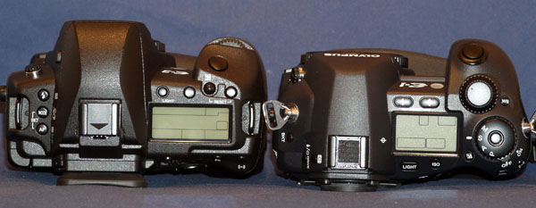 COMPARATIVE PHYSICAL SIZE: Size & weight: The E-3 is physically a large camera. On paper it may only be slightly larger than the E-1 but in reality it strikes me as altogether bigger. Comparing the dimensions the E-3 is only 4.2% larger in volume than the E-1. But weight wise the E-3 is 810g making it 23% or 150g heavier. The E-1 body with its HLD-2 power grip weighs 895g whereas the combined weight of the E-3 body with its HLD-4 easily breaks the 1kg barrier. And on top you have to fit a lens. Whether weight and bulk are significant to you is for you to judge. It is a major issue for me. Four-Thirds size promise: Perhaps this is the appropriate place to mention Olympus' 4/3rds advantage 'promise' of smaller sensor, smaller lenses, smaller cameras. The E-3 is no smaller than the Canon 40D or the Nikon D300. What's brought this about? In overcoming some of the 4/3rds disadvantages such as a small screen image, an oversized prism has been fitted to the E-3. To overcome the smaller sensors predisposition to noise at higher ISO values Olympus have fitted a sensor based Image Stabilization system that in conjunction with Zuiko Digital fast aperture lenses offers users the ability to capture images in dismal conditions without cranking up the ISO. Olympus claims the IS system alone provides a 5 stop advantage. These design progessions come with a cost and the cost, in the E-3, is body weight and bulk. However the size advantage in lens design and build remains as ZD and SWD lenses from Olympus are smaller and lighter than their cropped sensor competitors who rely in the main on lenses designed for 35mm. Olympus offer three ranges of lenses grouped by brightness and performance. Its Budget range offers the lightest and smallest of any makers lenses with IQ performance that belies their 'budget' tag. Here are some comparative shots against the E-1, E-330 and the diminutive E-400: