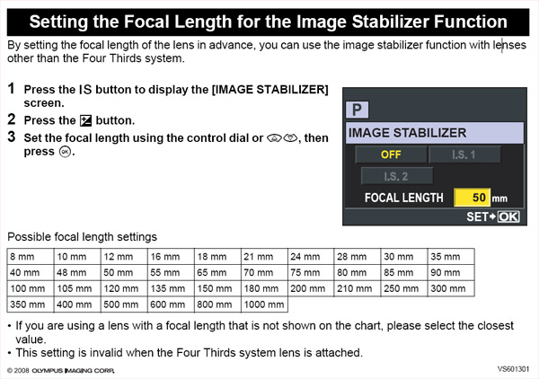 But, and I'm being completely honest here, I thought the SWD12-60 was just fine before the upgrade! FIRMWARE UPDATE FOR E-3 BODY: Olympus Japan, have just (29th January 2008) released this update (1.1) for the E-3 which: 1. Enables use of the Image Stabilization function with non-Four Thirds System interchangeable lenses by inputting a specific focal length. For details on operations see this chart: