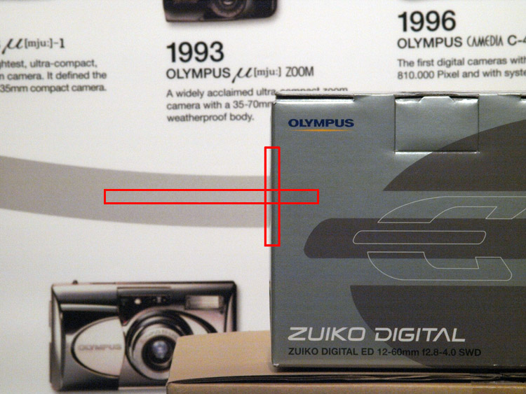 2. Matched the rotation of the dial on the rear of the Power Battery Holder HLD-4 and the movement direction of the AF target. 3. Increased the number of storable still pictures by improving the battery check when the Power Battery Holder HLD-4 is attached. 4. Focusing now stops immediately when the AF start button (AEL/AFL or Fn button) is released. 5. Corrected the phenomenon where the flash control caused an under exposure while using bounce flash at short distances with the FL-50R or FL-36R Electronic Flash. 6. Improved selection and prioritization of the central 5 ranging points when shooting in C-AF mode and Dynamic-single Target mode. OBSERVATIONS: That's some firmware upgrade (8mb in total). IS is now available for non-ZD lenses; the screen now offers the ability to enter the focal length of manual lenses from 8mm to 1000mm and not only OMZ focal lengths. This is comprehensive and thoughtful and I for one thank the company for making the E-3 so much more of a better camera for having this facility. I have given IS with the OMZ 90mm Macro lens a try and can report it works just fine; seemingly exactly the same as with ZD and SWD lenses except there's no focus confirmation by beep or green lamp. Lots more to come on this great update to the E-3! I have quickly tried the dynamic mode improvements but it seems the central point (still) only lights regardless of the point in focus - that's a pity. But more work needed from me on this. I shall study the other improvements as soon as I have time but I'm pleased to see Olympus have done something about the HLD4 battery issue I've been whinging about. We'll also see if the HLD4 will accept AA's now. IMPORTANT: The firmware upgrade re-sets all your settings back to default - be warned. AF TEST: As said, I've read some stirrings in the forums about AF failure in certain circumstances. I haven't been able to specifically repeat the AF problems some users are reporting. But I do know my copy E-3 with SWD12-60mm does not like low contrast, low detail subjects on which to focus. For example the cupboard doors in my study are a light creamy-brown beech grain (typical modern finish). Fill the viewfinder with the grain and AF will not lock. As soon as I place a door edge or handle in the frame and (if the AF is to all points or dynamic) it nails the focus in one. Do I want images of my cupboard doors - of course not, but as an example of AF defeat it serves a useful purpose. In all fairness Olympus warns of this issue in the manual. I pointed out earlier in this review the quicker and more sophisticated the AF process the more care we have to take in use. However, I cannot say if there is an AF issue with the E-3; I can only report on what I find with the one I am testing. And yes, I can make it refuse to AF lock in certain circumstances, (see * below) but I have no suspicion that the AF is routinely or even occasionally failing by either not locking on, beeping confirmation or displaying the green lamp when it is not focused. So what does this actually mean to me in everyday use? It means if I see those circumstances arise it may cause AF problems, so use my head, adjust the camera or my expectations. But, and this is a big BUT, I do know one experienced photographer has AF problems with his E-3 and long ZD lenses; I sympathize with him. After doing more research and reading folks concerns I set up this test scenario in my study, lit by artificial light. The front edge of the lens box is exactly 2 feet in front of the wall chart. With the E-3 on a tripod and using my ZD50-200 first version lens set to 200mm, I tried out the various AF focus points and patterns. I've marked the image below with a vertical red oblong that represents my focus point tracks up and down.