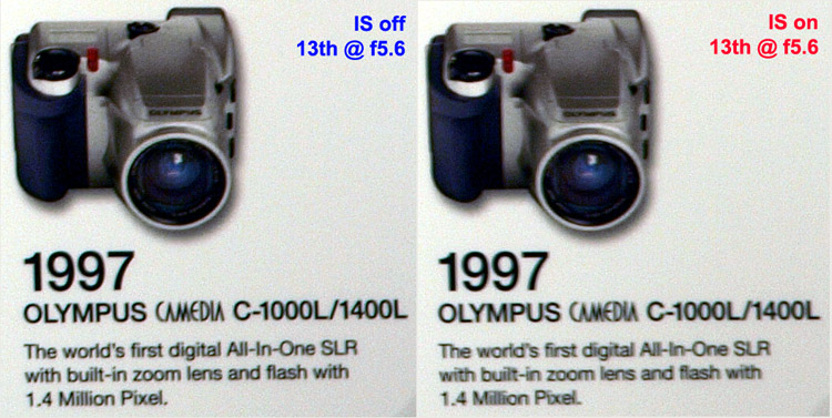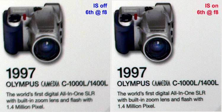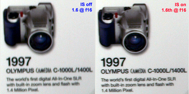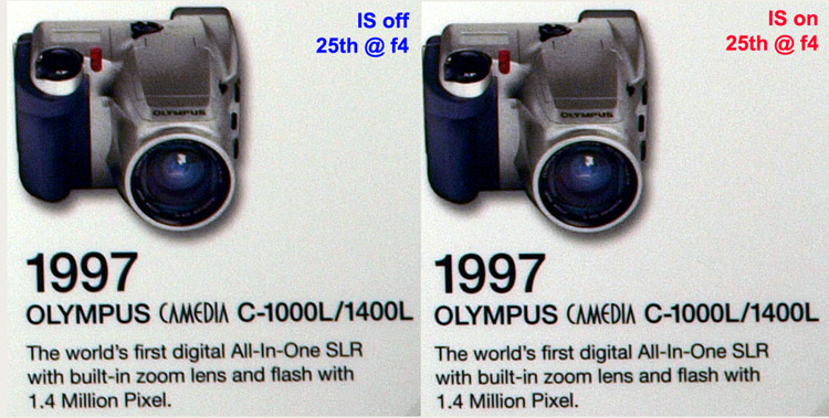 In AUTO mode the in-camera software performs simple zoning with curves applied to zoned areas to enhance brightness. So far I haven't been able to deduce whether in HIGH & LOW KEY the camera is simply manipulating exposure or if there is in-camera software at work too. In each mode except NORMAL contrast adjustments (overrides) are not applied. This being so leads me to think in-camera software is at work in all modes except NORMAL. That being so and where you have applied your personal contrast settings to your Picture Modes this one setting is going to override those applied changes (unless I'm completely mistaken). This is a further reason why care should be taken applying any gradation setting other than NORMAL. IMAGE STABILIZATION: This function is provided in-camera as opposed to in-lens. This means that with all 4/3rds lenses (Zuiko Digital or otherwise) IS will work seamlessly due to the communication routines between the chip in the lens and the processors in the body. If you use legacy lenses (non-4/3rds standard) which are not 'smart' (i.e. chip-less) the IS function will not work. I believe there is no overwhelming technological reason for this; Olympus have chosen not to enable it. However, the new and larger viewfinder on the E-3 translates into better manual focusing when using most legacy lenses. The E-3 offers Image Stabilization on three levels; OFF, ON (both axes) and ON (horizontal axis). The sensor mount has gyroscopic sensors fitted that measure the amount of movement caused by hand-shake etc and to compensate (it is far more complex than this). The best analogy I can visualise is a helicopter that would roll, pitch and yaw but for the skillful pilot who can keep the machine absolutely still by counteracting each/all of the forces. The gyro's do that for the sensor. WHEN TO USE: For everyday use I'd suggest you leave IS in the OFF position. There is a lot of electronic and mechanical activity happening when it is switched ON that doesn't need to be draining power and wearing out if the camera is being held steady anyway. There's an old 35mm maxim of 'shutter speed equalling focal length stops shake' (one over the focal length) that is a good guide to enabling IS. In essence it means the longer the lens the higher the shutter speed required to prevent shake. Thus if the focal length is 150mm (on a 4/3rds lens) the shutter speed needs to be: (150 x 2) 300mm = 300th of a second or higher. If the ambient light is insufficient to achieve the shutter speed required by this maxim then switch ON the IS. In addition, if the camera is mounted on a sturdy tripod I'd suggest the IS be switched OFF. Of course there will be occasions when these guide lines should be ignored; that's why we think and why we practice. TEST METHOD: First off I have no equipment with which to test the claims made by Olympus of a full 5 stops advantage. And secondly nearly every test I've read on IS receives criticism that it lacks credibility, either in logic or science. Andrzej Wrotniak undertook a detailed appraisal of the IS capability of his E-510 which makes a lot of sense to me; you can read his findings here (highly recommended). I'm sure Andrzej will admit that was a lot of work and I simply haven't got the time to reproduce it here so I'm going to keep my IS experiment simple and the results to a minimum. All I've done is take some shots of a large chart on my office wall using the same focus point and the edge of the chart as a vertical guide, from a distance of about eleven feet. I'm using the SWD12-60 at the long end to see by how much I can reduce the shutter speed before I get apparent camera shake. I'm reasonably confident I can hand hold a shot zoomed to 60mm at around 1/25th second. I am sitting down (an advantage), using the viewfinder (called head stabilization) and keeping my elbows tucked in to my body. The E-3 shutter is delightful to use as it allows the most delicate of 'squeezes'. However, there are so many variables in this scenario it is impossible to suggest it is anything but a 'rough guide' to IS performance in this particular set of circumstances only. And you'll just have to take my word that I didn't cheat - what would be the point! Below is an image of part of the wall chart. You can see the crops of are taken from the far right of the full image, below the centre line