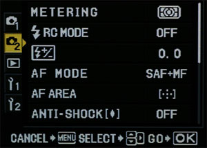 11 AF POINTS: Probably the second thing you notice when you look through the E-3 viewfinder is the new 11 AF point markers. Many users of previous E-System machines have complained about the relative lack of sophistication employed by Olympus' AF systems, both in number of points, accuracy and speed. In response Oympus have brought about both their range of SWD lenses that address the accuracy and speed issues, and an increased number of AF points as well as a choice of three AF patterns to suit most users. The AF system is highly configurable both in target, pattern and sensitivity. The AF sensor array uses both vertical and horizontal sensitivities on the cross point axes that are slightly shifted for the most accurate performance. There is a dedicated processor purely for the AF function. A new method of magnifying pixel density improves AF effectiveness in low-light conditions to a luminescence range of -2 to 19 EV. I have obtained accurate focus in almost no light conditions; the new system is very impressive. The SWD lenses provide a new means of motorising the lens movements in accurate and tiny steps that is both silent and virtually instant. The incredibly fast processing power of the E-3 brings it all together. Again this is not just the makers wild claims; AF is virtually instantaneous with an SWD lens. The AF point glows red on shutter half press and soon after the camera beeps and signals AF confirmation in the viewfinder; (NOTE: red AF point illumination does NOT indicate focus). The user has the choice of enabling the pointer square to be lit or not via the Spanner menu. The user can also choose the pattern from 3 basic choices; single point, single point dynamic (cross or partial cross shape of adjacent points enabled) and all points via the AF dedicated button. There is an over-ride provided in each selection allowing the user to move the pattern left, right, up or down, again via the dedicated button/wheel. Further customization is possible by the user being able to stipulate how the patterns cycle by selecting loop or spiral in the Spanner menu as well as determining AF point sensitivity; normal or small area. I think it fair to say that as AF systems become faster and more sophisticated the number of misses inevitably increases. The original E-1 AF system though slow, was very accurate. When Olympus improved this in a later firmware upgrade I noticed the number of times false positive confirmations were indicated rose. With this in mind the new AF regime on the E-3 benefits from how quick and convenient it is to 'feather' the shutter button after initial focus confirmation (and see note below).