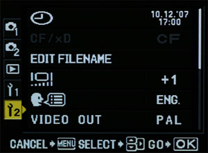 EXPOSURE CONTROL BUTTONS: The control buttons that provide instant access to main exposure attributes are in 3 groups on the top plate and the camera back. Top plate group right: Shutter, ISO, EXP (exposure compensation), WB (white balance) and LIGHT (command screen light). Top plate group left: FLASH (mode and compensation), MODE (shooting mode i.e. PASM), DRIVE, and AF (mode and metering). The flash pop-up release is on the left side of the prism hump. Back plate group: AEL/AEF (customizable), FUNCTION (customizable), AF point area, IS: off, on or only vertical. OK button that always accesses the Super Control Panel. INFO button which (in shooting mode) always accesses the Super Control Panel. FUNCTION CONTROL BUTTONS: The function buttons that provide access to various camera settings are all on the back plate of the camera. REVIEW button: access to the memory card images. 4-WAY controller with OK button: provides navigation on the menu and 'super control panel' screens. Access to the 'Super Control Panel' via the OK button. (None of the 4-WAY buttons accesses any screen.) OK button initiates the magnification facility when in Live View mode. DELETE button: deletes images on the memory card. INFO button: (in review mode) riffles through the exif, histogram and highlight & shadow screens; (in taking mode) accesses the 'Super Control Panel'. MENU Button: (all modes) accesses the main menu. LV Monitor Button: (all modes) initiates the mirror and sensor for direct TTL viewing. WHEELS: There are two command wheels on the body, front and back. With HLD4 grip fitted a further 2 are provided. These are used in conjuction with most of the buttons. For some exposure attribute changes both wheels will cycle the same icon whereas for other attributes front and back wheels will cycle through different icons. Example 1: Press WB: the selection is performed by either control wheel (or 4-way buttons) Example 2: Press FLASH: the front wheel alters compensation and the rear wheel cycles flash modes. Example 3: Press AF POINT [---]: hold down button, turn front wheel to cycle pattern choice; release button, turn front wheel to cycle horizontal point; rear wheel to cycle vertical point. DISPLAY: The rear screen has two basic purposes; to review the images and to display settings and choices for change or confirmation. In REVIEW mode the user can chose from the menu either single screen for each image or displaying 4 to 25 images at once. Magnifying each image is done via the rear control wheel; RIGHT to magnify 2,3,5,7,10 & 14X and LEFT to display single, 4, 9, 12 and 25 images per screen. In addition continuing to turn the magnifying wheel to the left eventually displays the 'calendar' screen. This screen shows the current month and in the appropriate day box the image that starts that days captures. If no images were recorded on the day it remains blank. This allows the user to quickly access a months work by scrolling through the calendar to the date required and turning the rear wheel to the right. Previous/forward months can be accessed by cycling up/down the screen with the UP/DOWN button of the 4-way controller. In MENU or Super Control Panel (SCP) mode screens are displayed in monotones + yellow to highlight the position/attribute being accessed. The E-3 will display exposure attributes in 3 areas simultaneously: viewfinder, command panel and rear LCD panel. When any exposure control button is pressed the relevant icon on whichever screen you are looking at will be lit or accentuated; to alter turn one of the wheels and the icon will cycle through the choices. The LCD display on the rear of the E-3 will be either the Super Control Panel or the two additional screens designed for special purposes only, these being the AF area select screen and the IS choice screen. The E-3 will display camera function choice or change (as opposed to exposure attributes) on the rear display only (and not simultaneously in the VF or command panel) and these screens are accessed via the MENU button. So there are three areas of display; Viewfinder, Command panel, Rear LCD panel, and three types of display; exposure attribute information only, Super Control Panel (all exposure information) or Main Menu (all camera information). It may seem complex but the whole process works seamlessly particularly when adjusting the all important exposure controls. GENERAL: Once you are familiar with the E-3 exposure changes are made with buttons and/or wheels while referencing the rear panel, the top plate command screen or the viewfinder readout. This offers real flexibility for new users or those coming from existing Olympus DSLR's already familiar with its menu system. For professional users control of exposure functions without taking the eye from the viewfinder is almost a necessity. The camera control system works on various levels and may be accessed and displayed in different ways. But it all works in harmony to give the user a seamless and intuitive interface into the complex arena of camera control and exposure settings. But basically the rule is buttons and/or OK for exposure - all else via menu. For a first time user it might appear complex but with a little study and practice it soon becomes second nature. It is genuinely harder to describe than operate! CHECKING THE SERVICE SCREENS: I load a charged BLM1 and the first thing I do is check the 'hidden' screens to acertain the level of use the camera has gone through before me. It is also handy to make sure there are no outstanding fault codes registered which would mean sending the machine in for service. Screen (page) 2 tells me the shutter has had 83 activations, the flash 9 firings and the SSWF 14 occassions. Screen (page) 4 is blank indicating no fault codes. Satisfied my camera has been subject of factory testing only I am now secure in the knowledge I am its first owner! If you want to know how to check the 'hidden' screens please go to this page here. MENU: Once I'