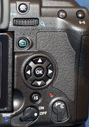 I've already remarked on the small buttons. Though all the camera buttons communicate with the PCB through a membrane, the 4-way controller buttons seem additionally wobbly and lack any tactile or 'clicky' feedback. I prefer the ones used on the older E-1; but still this is a small point. The rubber eye piece VF surround is much larger than any other E-system machine and bigger even than the E-1's optional eyepiece. The actual exit pupil glass is exactly the same size as other 4/3rds cameras so allowing use of eyepiece accessories, though the final sighting pupil has a mask slightly larger on the E-3 reflecting its 1.15 magnification. The eyepiece dioptre and shutter knobs are hidden behind the large shroud of the rubber eyepiece and not immediately obvious. However, both can be operated easily and there's no absolutely need to remove the rubber shroud. The eye-piece shutter in particular works nicely with a flick of the left thumbnail.