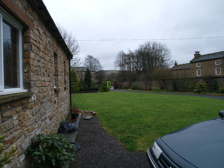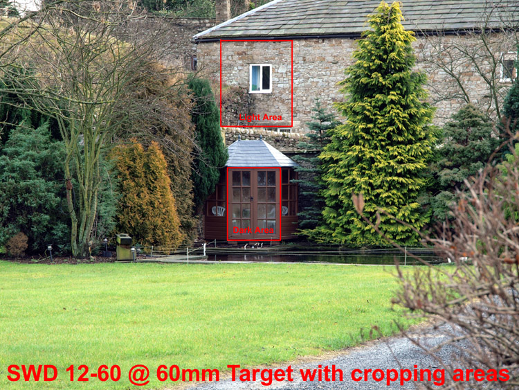 The second test should clear up any misgivings. The lens tested is free of any back/front focus issues. Let's proceed with the remaining tests and see how good, or otherwise, the new lens performs. SWD12-60mm LENS TESTING - METHOD: I try and maintain some consistency in my methodology; not that it needs much explanation nor is it complex. The camera is mounted on a tripod that does not move between shots. The tripod position is marked so I can repeat the test from exactly the same place over time. Any apparent optical differences observed in the results for different lenses is down to lens position on the mount and internal configuration as the tripod head is completely static for each series of shots. The camera is switched off for each lens change. I used the hood as it was raining lightly. For this series of test shots I used the following: * E-3 body mounted on tripod and shutter activated by RM1. * The settings on my E-3 are reset to default for these tests except: * Camera (basic) settings: ISO 200; LF; WB=AUTO, ESP, SAF+MF, * I do not use RAW; highest quality JPG's seem the most appropriate output file. * The results posted below are straight from the camera and not altered other than cropping and re-sizing for the web. TEST ONE: SWD 12-60mm versus ZD14-54mm wide open: The object of the test is to show how good (or bad) each of the accepted 'kit' lenses are against my standard target of the stone pillar with the small stone sign that reads DRAYCOTT HALL. Distance to target from tripod is approx 180 ft. Today is cloudy and overcast but reasonably bright. It was raining lightly when I started but this petered out later. The lighting did not change.