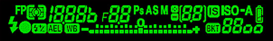 Left to Right Top: FP Flash, Metering Mode, Shutter speed, Aperture, Shooting Mode, Comp +/-, Buffer, IS, Auto ISO, Battery. Left to Right Bottom: Flash ready, AF confirm, Flash comp, AE Lock, WB, Exposure, Bracket, ISO sensitivity.