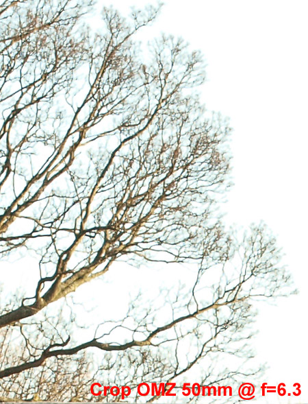 CRITIQUE: Having undertaken this test I've got to admit the SWD offers slightly better performance in terms of sharpness than the ZD 14-54mm. And, of course, the new lens has a nicer (more usable) spread though is a tad slower across the range. That said I was amazed at how well the old OMZ 50mm did which, apart from a yellowish cast delivered more sharpness than I possibly imagined with very good control over CA. I believe this performance reflects the very accurate metering in the new E-3. The yellowish tint must be the result of an imbalance in coatings as the 50mm f=1.2 was not made with 'earth elements' as far as I know.