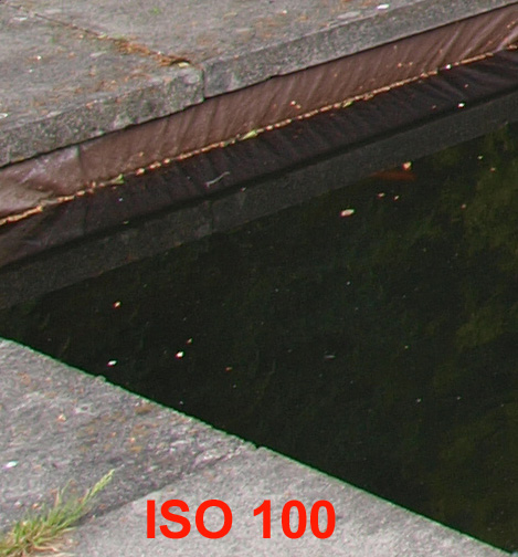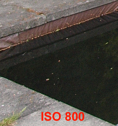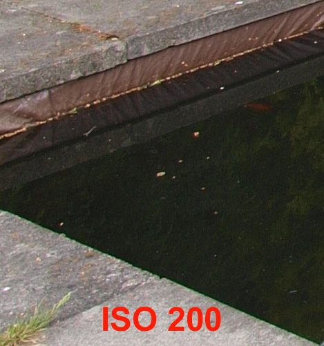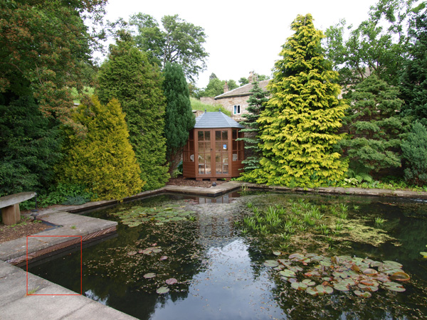 MORE TEST IMAGES: As promised I have taken more sets of images for closer examination of ISO performance and some in camera processing, but have not managed to go further than my garden. However, I think they will should do the job. ISO Performance: On a bright and clear day I set my tripod up next to the pond to give me some dark areas to show the type and distribution on any ISO noise that might appear as the gain is cranked up. This is the general view with the crop section marked: