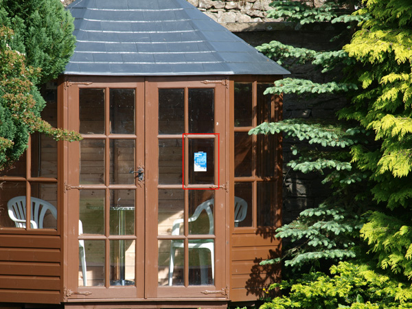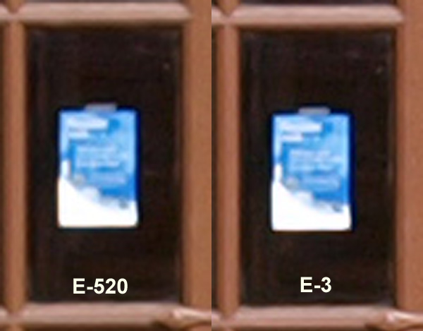 Personally I never use High & Low Key settings as there are easier ways to achieve the goal but I use Auto Gradation quite a lot and this is likely because I'm a great jpg fan. I rarely use the RAW format as I firmly believe that virtually all Olympus DSLR jpg engines deliver very high quality results straight out of the camera. Don't get me wrong, I can and have processed RAW images, but I rarely end up with a result that justifies the overall effort involved. But if the camera offers a setting that will enhance its already excellent jpg engine, as does Auto Gradation, I'm all for using it. Choosing jpg saves time, as does anything that enhances jpg's straight from the camera. I prefer to spend my time out and and about taking photo's rather than sitting in front of my PC processing RAW files. But, each to his own! Comparing Images from E-3 to E-520: I have done a quick series of comparative images with both cameras using the ZD50-200mm lens to see what the differences might be. I set the tripod up at 130 feet away from the target (an Olympus flyer less than A5 size) that was taped to one of the glass panels. Yes, I cleaned the glass! The first set is with the ZD50-200mm set at 50mm, with the crops at 100% shown below.