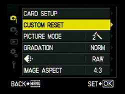 (H) RECORD/ERASE: QUICK ERASE: On, Off. Should you wish to delete an image when reviewing, quick erase will simply erase the image without further question when you press the delete button. Default is OFF for good reason. OBSERVATIONS: Setting to ON is dangerous. There is no second chance to change your mind. Leave at OFF. RAW+JPEG erase: JPEG, RAW, RAW+JPEG (decide what is removed when you delete a RAW+JPEG photo) This selection only applies if you save your images in two formats (ORF and JPEG) consecutively. If so, and when you wish to delete the image(s) while being viewed, on pressing the DELETE button the camera will delete either one or the other or both formats together of the image, depending how you set this menu choice. I occasionally use RAW+JPEG so I have this set to JPG thus leaving the RAW version. If you never save in dual format then leave this at the default setting of RAW+JPG. FILE NAME: Auto, Reset Here you may set how the file number is recorded when taking an image either when starting a fresh sequence or with a new card. In this context the meaning of RESET = starts from new i.e. 0001; or AUTO = continues from the last recognisable sequence. OBSERVATIONS: This choice can lead to confusion. If you set to RESET there is the risk the camera may mark two files with the same number if two cards are used on the same day - not good. ALWAYS set this to AUTO. PRIORITY SET: This setting controls the box that pops up when you press the DELETE button when reviewing your shots. By default this is set to NO which means that you have to move the highlighted box from NO to YES with the cursor key in the ERASE mode (one additional enforced step that may prevent accidental deletion). If you set this to YES you do not have to move the highlighted box as it is set to YES. Effectively it saves you one stage in the delete process. I have all my canmeras set to YES - it is much quicker. DPI SETTING: Auto, Custom (allows setting of dpi) Of all the terminology associated with digital imaging DPI and PPI are the most confusing. Leave this setting on AUTO. CF/xD If you mount only one card this setting is greyed out. Where you mount both cards this setting allows you to set which is used first. I only use xD for emergency use so I have this set to CF. Your preference might be different though I doubt it. EDIT FILENAME If you wish to change the file naming that goes on in the background when shots are recorded to the card, this is where you can. You may change the first and/or second characters if you wish. Normally the file is prefixed with a 'P' (or '_' if working in Adobe colour space). The second digit represents the month (Jan = 1; ~ Sept = 9; Oct = A; ~ Dec = C. The next two refer the day thus a file named PC250157 is interpreted as Olympus File; December 25th: image number 157 out of a possible 9,999. OBSERVATIONS: I believe this is an understandable way to name files and can see no reason to change it. As I archive all my images by date I can see the date of any file via this number. So, I have left mine at default setting OFF/OFF. However, you may have different needs.
