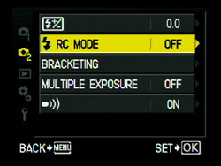 FLASH RC MODE: On/Off (controls wireless flashes FL36R/50R) This setting allows you to remotely use multiple compatible (RC) flash units that can be controlled and adjusted from the camera menu. If turned ON the camera menu will always request the flash settings to be input; leave switched OFF. OBSERVATIONS: Most folks will not be using such a set up so leave this set to OFF. When using a multiple flash setup you will need to study the flash manual to set up individual flashes for the effect(s) you desire.