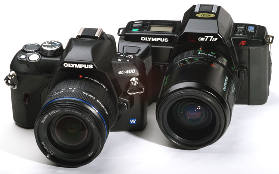 When we see comparable cameras together it is very plain how much progress has been made. Olympus had a disastrous dalliance with Auto-Focus for many reasons, one being that Mr Maitani is said to have disliked the technology. (I suspect the Honeywell suit was more to blame!) That said the OM707 was most unsuccessful not because of the lenses but more due to the unreliable vertical shutter mechanism that was a departure for the company. Actually, the AF lenses were not bad; but note they are not designated OM or Zuiko, only 'Olympus Lens' appears on the side of the barrel. There is no competition here whatsoever. The E-400 is simply better all round. Smaller, lighter, better specified and more capable. SPECIFICATION COMPARISON: Much as I'd like to sit down and compare the E-400 to the OM2n from a specification aspect, I suspect we all know the answer. Today's offering is more sophisticated by far. The OM2n was a fabulous camera for its time offering on Auto an aperture preferred metering system with a selectable manual (shutter preferred) mode; an elctro-magnetic controlled shutter for accuracy with a manual backup; ASA 25-1000; compensation +2 to -2; shutter range of several minutes through to 1/1000th second; Off the film metering; a world beating flash control system and of course the full OM range of lenses and accessories. The only areas where the E-system cameras cannot compare is (1) an equivalent to OTF metering at the point of exposure: no doubt the designers will get round this in some way. We have taken a small step back by losing this facility. (2) No mirror lock-up: this is a serious omission in my opinion but if the camera is destined to be an entry level machine I can understand the thinking. To counter these shortfalls I could offer the argument that the E-400 has the equivalent of an internal motor drive with its buffering facility, whereas the OM required either an external winder or a full blown motor drive. However, I'm not going to push the comaprison any further; they both take great photographs in the right hands. Personally, since going digital in 2000, I've hardly used any of my film caneras. CONCLUSION: There's little I want to add except one major observation about the general aesthetics of the E-400 (and presumably all that follow). All the E-System predecessors suffered from a lens mount bias toward the users left. This was particularly noticeable on the E-500, to the point where it almost caused ugliness. While the E-400 has almost overcome this it still has a little way to go before it matches the ever so slight assymetrical look of the OM bodies. So, yes, I think within the confines of this article I can favourably compare the E-400 to an OM(2n) anyway. However, from my personal point of view I haven't fallen for the E-400. For me it is too small and light with too little real estate to grab hold of. I miss a grip but can see how its inclusion would have spoiled the overall objective. I find the strap hangers a damn nuisance and I'm not keen on the eye relief. But I can see that it and its sibling will add hugely to Olympus' success.