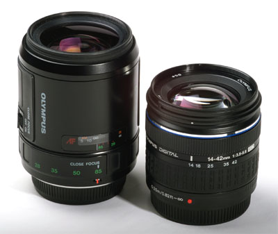 Comparing these lenses with anything from the OM range is going to be difficult. The 'standard' zoom (ZD 14-42) is equivalent to 28-84 and the nearest OM is the peculiar AF 28-85mm for the unpopular OM707 range. There is no OM equivalent to the ZD 40-150; this was poorly achieved in at least two zooms, the OMZ 28-48mm S with the OMZ 50-250 for the 50-150 bit! (The 50-250 Zoom is a rare lens).