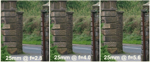 Here are the first set of crops from the ZD25mm lens mounted on the E-3 in A mode with the lens set to f=2.8, 4.0, 5.6, 8.0, 11, 16. The day was dull and overcast; about 3.30 in the afternoon, it was not raining and was a typical UK overcast early autumn day with diffuse light behind a white sky.