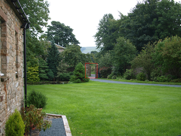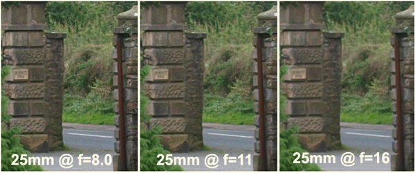 STANDARD TEST: I set up the tripod to do some test shots against my normal target which is a stone gate pillar with a small house sign (landscape A4 size) that is some 220 feet from the camera-on-tripod position. I decide to compare the pancake against the ZD14-54mm set to 25mm at a selection of apertures. First I mount the ZD25mm. For all sessions of testing I use the E-3 with these base settings: A mode, ESP, ISO = 100, WB AUTO, NR= OFF, S-AF, File = L Super Fine JPG, COMPENSATION = 0; tripod mounted and shutter tripped with RC-C1 (Generic version of RM1) remote.