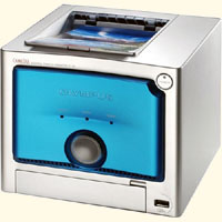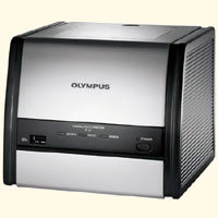 FIRST IMPRESSIONS: For such a tiny printer this is a big box! The box contains the printer, power supply/adapter and 2 leads, standard size box of consumables, documentation and driver software. The consumables box contains a plastic cassette with 50 Photo sheets and the ribbon. The printer is an elegant white metal flake finished plastic box 6.6" W x 5.7" D x 2.8" H with a fine chrome strip around the top that looks like a lid but isn't. There's a door to the front where the paper cassette fits and another to the side where the ribbon slides in. The ON/OFF button is on the top and glows green when ON. There are two red ERROR lights for paper and ribbon and a wide blue ACCESS light to let you know it's talking. The P-S100 is not equipped with any form of memory card slots or a mini-screen for pre-viewing or manipulating images. On the back of the printer are four connectors; power in, PC USB in, camera USB in and a hard disk drive interface for FE/IR systems. This printer was designed for the IR/FE range of Olympus cameras; part of a design effort to integrate printer, camera and portable hard disk. However it is also sold as an independent printer. It is PictBridge; this means it will print from certain cameras and other devices without the need for a PC. It also works as a normal PC connected printer too. It is small, neat and very classy.
