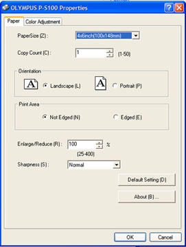PRINTER IN ACTION: Although the printer is tiny it does require a much larger footprint on your desktop to accomodate the front paper cassette and the rear projection. Allow about 7" (W) x 16" (D). With the P-S100 connected to your PC transfer of image and instruction to the printer is very quick. The blue ACCESS light strobes telling you the communication is fine. When the tranfer is complete the printer whirrs and printing starts. It's a multistage process. The paper is taken from the cassette and disappears through the printer to appear out of the back by about 3.5". It now passes forward and in this, the first pass, the yellow is laid down. The process repeats for magenta, cyan and then the protective film. Four passes and fascinating to watch - for the first few times anyway! The print emerges pristine, dry and immediately handleable. Speed is acceptable; 88 seconds for the print process. This might seem a long time but my inkjet was as slow at the resolution needed to produce a Photo Quality print. I'm always wary of super fast printers - these are the ones that spit the paper out or get it misaligned in their hurry to get the job done. The stated 306dpi in dye sub terms is equivalent to about 4800 x 4800 from an inkjet or laser. I note that other Olympus dye-subs are rated at 312dpi. I do not know why the P-S100 is 2% lower.