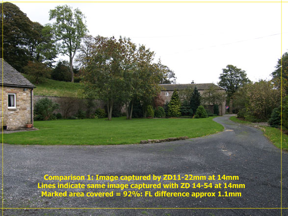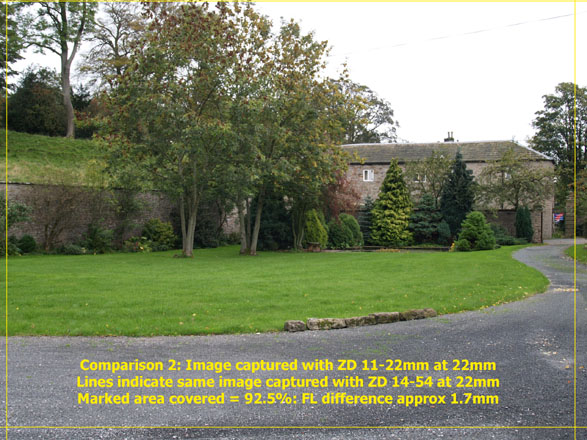 COMPARISON 2: Once again it's plain that at 22mm the ZD11-22mm captures more than the ZD14-54 set to the same focal length. The slightly less difference of 7.5% (could be down to my eyes or maths!) equates roughly to around 1.7 millimeters of focal length at this setting.