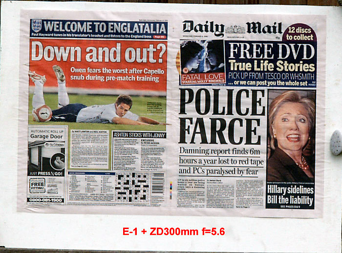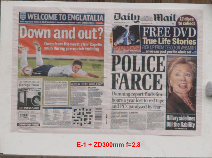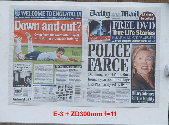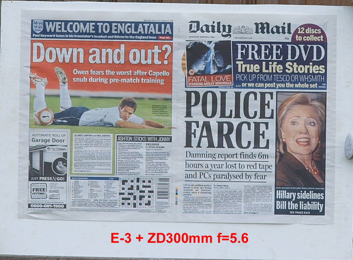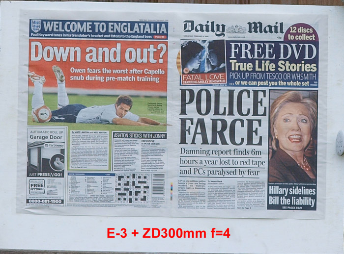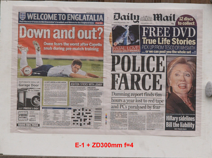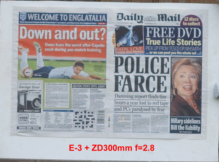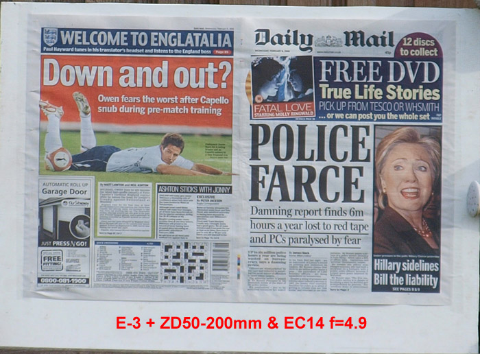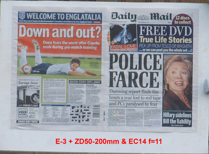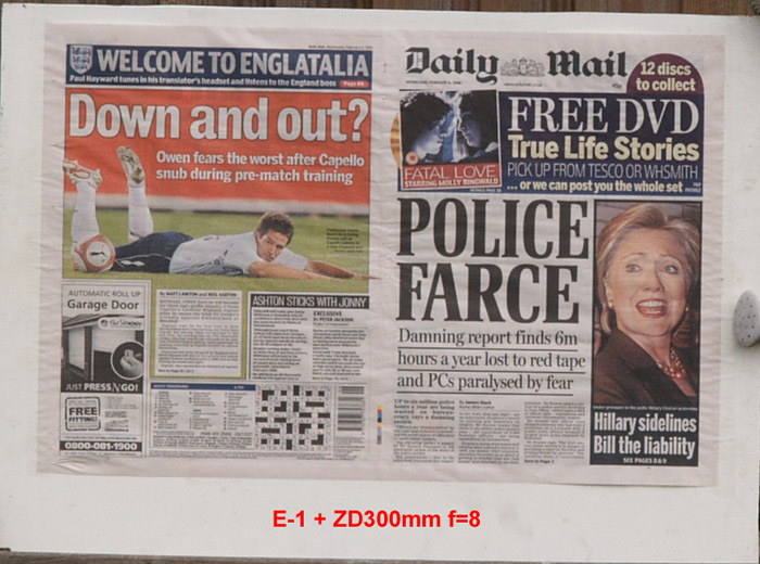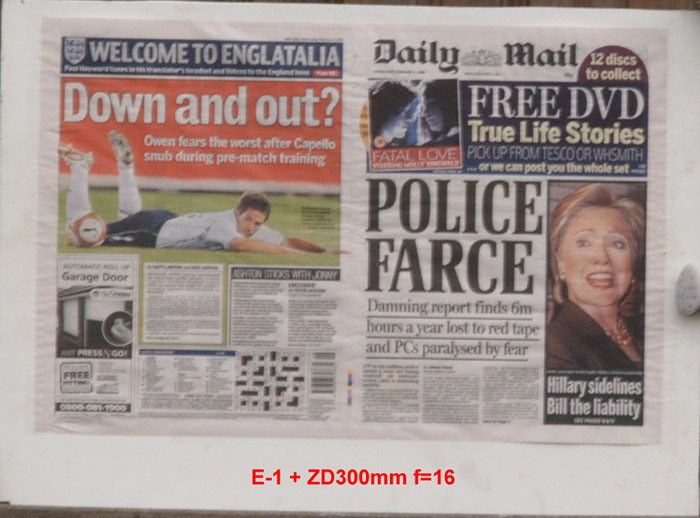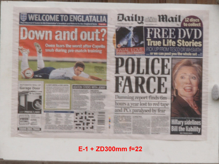 CRITIQUE: I've judged these results by looking at the GARAGE DOOR advertisement in the bottom left of the paper. The words above the illustration are: AUTOMATIC ROLL UP and if you compare how easily,or otherwise, you can distinguish this lettering will give you an idea of how good the delivered resolution has been. It's plain to see the sensor is the bottleneck here with the lens resolution far outstrippimg that of the 5MP sensor. While the images are quite good, even at the sweet spot of f5.6 ~ f8 they are a little 'lacking' in 'bite'. However, when compared to the 10MP sensor on the E-3 these are not too bad at all. Remember that to double the resolution you need to quadruple the pixel count.