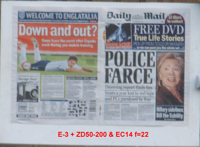 CRITIQUE: In the above series of six images I think the ZD50-200mm in combination with the EC14 Teleconverter does quite a good job bearing in mind the difference in price between the two lenses (lens combinations.) The ZD300mm costs around £4,500 whereas the combination will cost you £1000. Is there £3000 worth of difference - well only you can judge. Certainly in the first three crops (f=4.9, f=5.6 and f=8) there is little to compalin about; these are better than the ZD300mm on the E-1. Compared to the results from the ZD300mm on the E-3 I think they stand up quite well. OK they are a tad softer with marginally less bite but you can still easily read the selected text without difficulty. Is the combination on the edge of its resolving power? Quite possibly considering the amount of glass the light is coming through (22 elements in 20 groups) there's a lot of potential for a bad surface. But we won't know until the next generation of E-cameras arrives with increased pixel counts. Again, and just the same as the ZD300mm performance on the E-1 and E-3 diffraction kicks in around f=11 to f=12 but in this case the EC14 magnifies the diffraction effect making it appear much worse in the crops at f=16 and f=22. Don't forget the defocused areas produced by the ZD50-200's 7 bladed diaphragm plus EC14 will not be as well achieved as the 9 blades of the ZD300mm's diaphragm. Unfortunately we don't have an example to show you. So what's the difference? Wide open the combination sets off at f=4.9 as opposed to f=2.8 with the ZD300mm. That's very nearly a stop and a third. Therein lies the significant difference, the ZD300mm is innately faster. The apertures level out at f=5.6. Performance from the combination is surprisingly good, way better than I'd anticipated compared to the Big Tuna. But please remember we have only examined the centre of the images, corner resolution may not be as good.